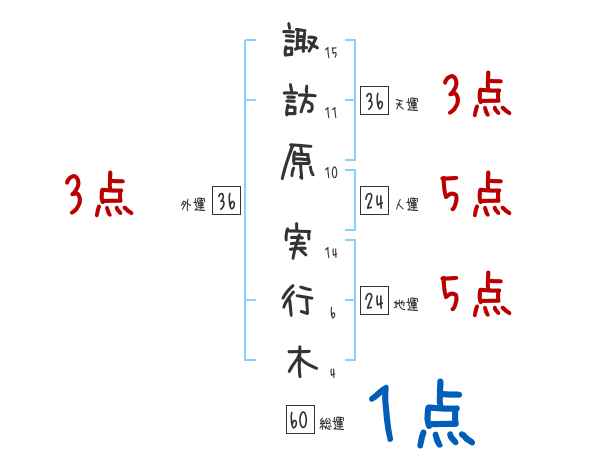 総運![]() | 諏訪原実行木さんの総運は60画の1つ星!悲観的で迷いやすい。波乱が多く損をしないように。 あなたの人生を表す1番重要な運勢です。生涯を通じて影響する総合運となり、主に50歳以降の晩年期に影響を及ぼします。 |
