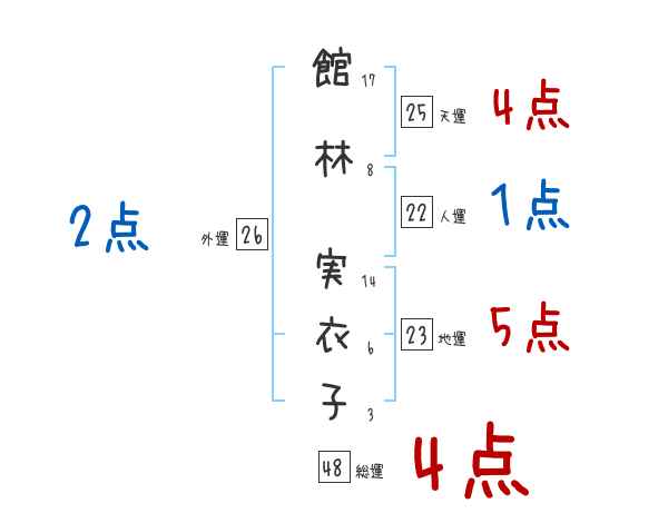 天運![]() | 館林実衣子さんの天運は25画の4つ星!個性があり才能があふれる。強運の持ち主で発展する。 家系が持つ宿命的な運勢を表します。祖先から受け継いだ苗字ですので自分の力が及びません。家柄を象徴します。 |