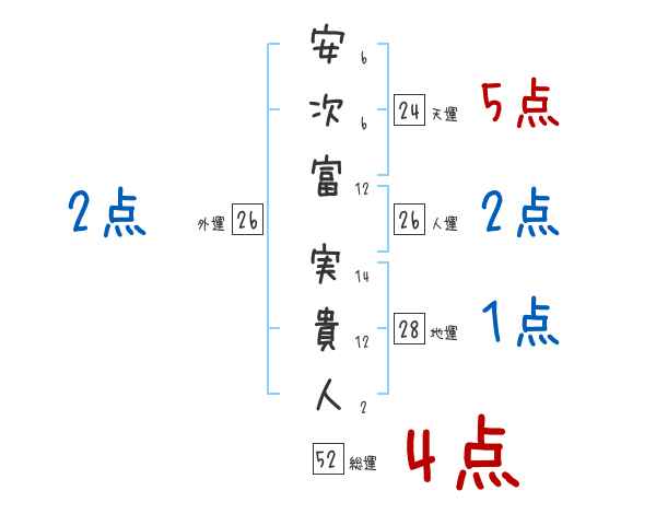 天運![]() | 安次富実貴人さんの天運は24画の5つ星!家庭運が良く順調な人生。金運にも恵まれる。 家系が持つ宿命的な運勢を表します。祖先から受け継いだ苗字ですので自分の力が及びません。家柄を象徴します。 |