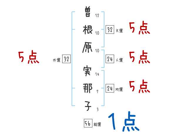 天運![]() | 曽根原実那子さんの天運は32画の5つ星!柔軟性があり成功する。チャンスが多く金運が良い。 家系が持つ宿命的な運勢を表します。祖先から受け継いだ苗字ですので自分の力が及びません。家柄を象徴します。 |