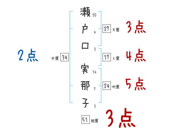 総運![]() | 瀬戸口実那子さんの総運は51画の3つ星!変化が激しく、危険に注意。堅実な性格。 あなたの人生を表す1番重要な運勢です。生涯を通じて影響する総合運となり、主に50歳以降の晩年期に影響を及ぼします。 |