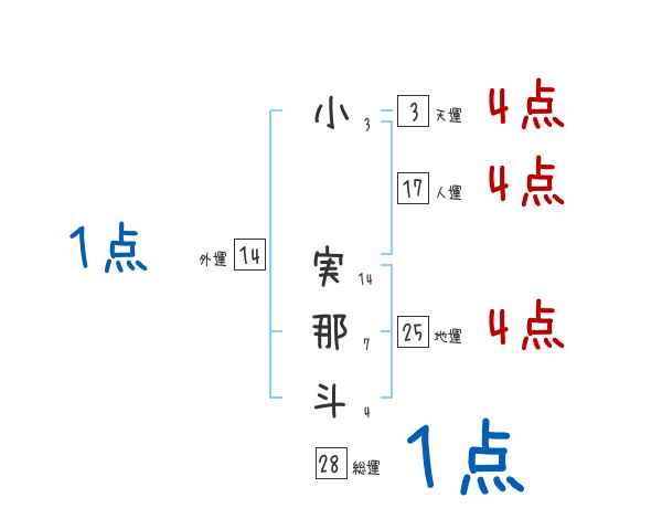 外運![]() | 小実那斗さんの外運は14画の1つ星!人に対して優しいがストレスを溜め込みがち。人間関係のトラブルを避けるよう気をつけましょう。 生活面を象徴する運勢です。外部から受ける影響力を表し、結婚運、家庭運や職場、環境への順応性を表します。 |