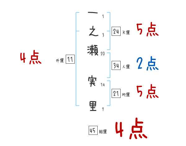 総運![]() | 一之瀬実里さんの総運は45画の4つ星!もくもくと物事を進め達成する。地味な努力家。 あなたの人生を表す1番重要な運勢です。生涯を通じて影響する総合運となり、主に50歳以降の晩年期に影響を及ぼします。 |