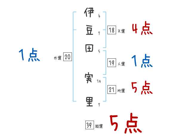 人運![]() | 伊豆田実里さんの人運は19画の1つ星!優れた才能を持ちますが、協調性が足りないことも。周りの人と協力する事を意識しましょう。 性格や才能などを表す2番目に重要な運勢です。人間関係や協調性、社会的な成功に影響します。主に20歳から50歳ぐらいまでの中年期の運勢を表します。 |
