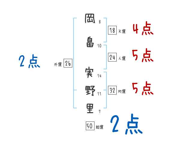 人運![]() | 岡畠実野里さんの人運は24画の5つ星!家庭運が良く順調な人生。金運にも恵まれる。 性格や才能などを表す2番目に重要な運勢です。人間関係や協調性、社会的な成功に影響します。主に20歳から50歳ぐらいまでの中年期の運勢を表します。 |