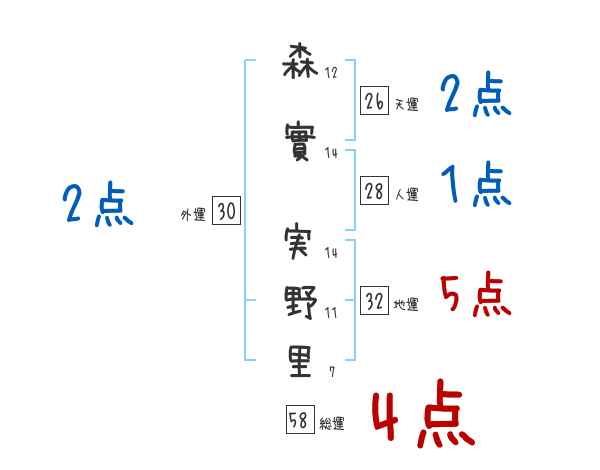 天運![]() | 森實実野里さんの天運は26画の2つ星!波瀾万丈かも。信頼できる人を大事にしましょう。 家系が持つ宿命的な運勢を表します。祖先から受け継いだ苗字ですので自分の力が及びません。家柄を象徴します。 |