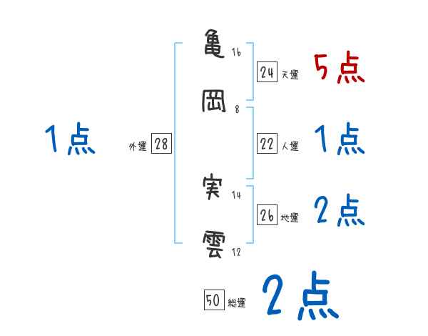 総運![]() | 亀岡実雲さんの総運は50画の2つ星!浮き沈みが激しく不安定。しりすぼみに衰退しやすいので注意しましょう。 あなたの人生を表す1番重要な運勢です。生涯を通じて影響する総合運となり、主に50歳以降の晩年期に影響を及ぼします。 |
