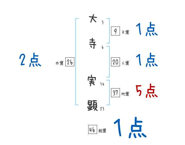 天運![]() | 大寺実顕さんの天運は9画の1つ星!消極的で才能を発揮することが苦手なことも。周りの意見に耳を傾けましょう。 家系が持つ宿命的な運勢を表します。祖先から受け継いだ苗字ですので自分の力が及びません。家柄を象徴します。 |