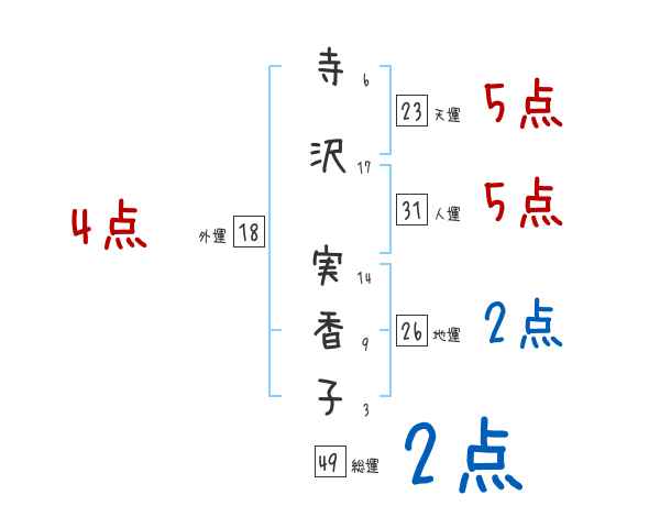 外運![]() | 寺沢実香子さんの外運は18画の4つ星!情熱的で剛気。忍耐力があり信頼される。 生活面を象徴する運勢です。外部から受ける影響力を表し、結婚運、家庭運や職場、環境への順応性を表します。 |