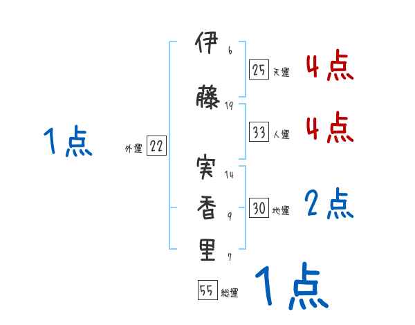天運![]() | 伊藤実香里さんの天運は25画の4つ星!個性があり才能があふれる。強運の持ち主で発展する。 家系が持つ宿命的な運勢を表します。祖先から受け継いだ苗字ですので自分の力が及びません。家柄を象徴します。 |