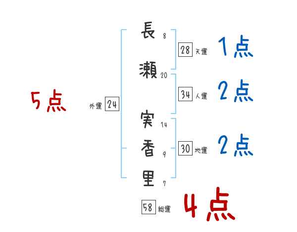 天運![]() | 長瀬実香里さんの天運は28画の1つ星!家庭環境に注意。スポーツで活躍できる能力があるかも。 家系が持つ宿命的な運勢を表します。祖先から受け継いだ苗字ですので自分の力が及びません。家柄を象徴します。 |