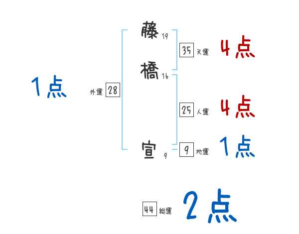 天運![]() | 藤橋宣さんの天運は35画の4つ星!温厚な性格で感受性が高い。穏和な性格で人望が厚い。 家系が持つ宿命的な運勢を表します。祖先から受け継いだ苗字ですので自分の力が及びません。家柄を象徴します。 |