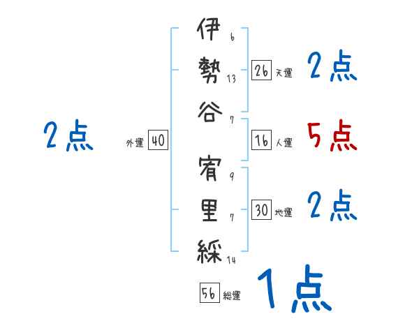総運![]() | 伊勢谷宥里綵さんの総運は56画の1つ星!消極的で無気力になりがち。誠実な気持ちが必要でしょう。 あなたの人生を表す1番重要な運勢です。生涯を通じて影響する総合運となり、主に50歳以降の晩年期に影響を及ぼします。 |