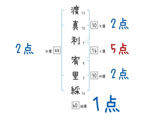 天運![]() | 渡真利宥里綵さんの天運は30画の2つ星!浮き沈みの激しさに注意しましょう。 家系が持つ宿命的な運勢を表します。祖先から受け継いだ苗字ですので自分の力が及びません。家柄を象徴します。 |