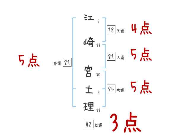 外運![]() | 江崎宮土理さんの外運は21画の5つ星!統率力がある。独立し成功する。名誉を手に入れる。 生活面を象徴する運勢です。外部から受ける影響力を表し、結婚運、家庭運や職場、環境への順応性を表します。 |