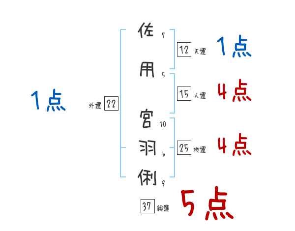 外運![]() | 佐用宮羽俐さんの外運は22画の1つ星!努力することが苦手ないっぽう手先が器用。芸術性にも優れる。 生活面を象徴する運勢です。外部から受ける影響力を表し、結婚運、家庭運や職場、環境への順応性を表します。 |