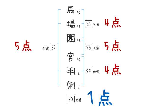 人運![]() | 馬場園宮羽俐さんの人運は23画の5つ星!想像力に優れ活力がある。一代で成功し名誉を手に入れる。 性格や才能などを表す2番目に重要な運勢です。人間関係や協調性、社会的な成功に影響します。主に20歳から50歳ぐらいまでの中年期の運勢を表します。 |