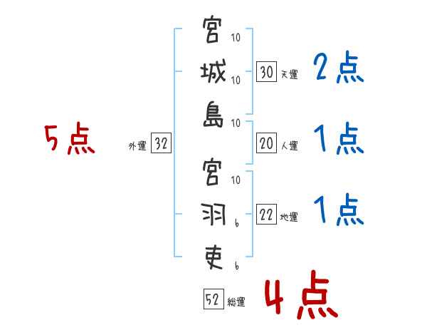 外運![]() | 宮城島宮羽吏さんの外運は32画の5つ星!柔軟性があり成功する。チャンスが多く金運が良い。 生活面を象徴する運勢です。外部から受ける影響力を表し、結婚運、家庭運や職場、環境への順応性を表します。 |