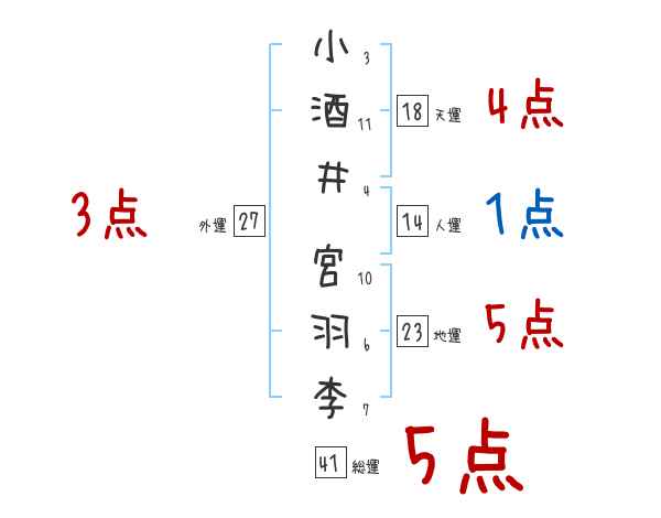 天運![]() | 小酒井宮羽李さんの天運は18画の4つ星!情熱的で剛気。忍耐力があり信頼される。 家系が持つ宿命的な運勢を表します。祖先から受け継いだ苗字ですので自分の力が及びません。家柄を象徴します。 |