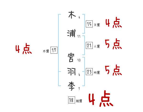 外運![]() | 木浦宮羽李さんの外運は17画の4つ星!積極的な行動力。地位を気づき財産を手に入れる。純粋な心と直感力。 生活面を象徴する運勢です。外部から受ける影響力を表し、結婚運、家庭運や職場、環境への順応性を表します。 |