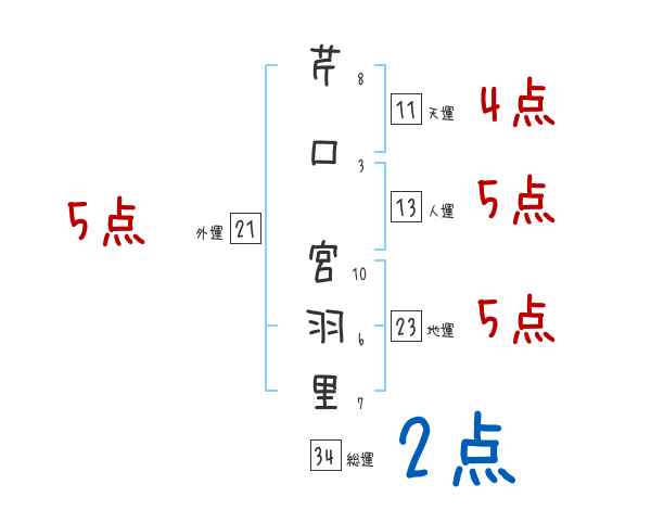 外運![]() | 芹口宮羽里さんの外運は21画の5つ星!統率力がある。独立し成功する。名誉を手に入れる。 生活面を象徴する運勢です。外部から受ける影響力を表し、結婚運、家庭運や職場、環境への順応性を表します。 |