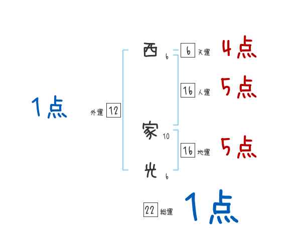 人運![]() | 西家光さんの人運は16画の5つ星!人望が厚く大きく発展する。逆転成功が見える。 性格や才能などを表す2番目に重要な運勢です。人間関係や協調性、社会的な成功に影響します。主に20歳から50歳ぐらいまでの中年期の運勢を表します。 |