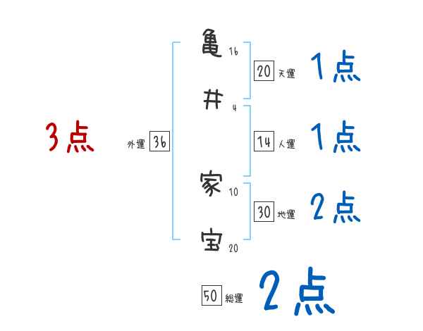 外運![]() | 亀井家宝さんの外運は36画の3つ星!先見性が豊かです。多少神経質で苦労することも。 生活面を象徴する運勢です。外部から受ける影響力を表し、結婚運、家庭運や職場、環境への順応性を表します。 |