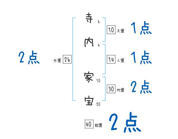 天運![]() | 寺内家宝さんの天運は10画の1つ星!不安を感じやすい傾向。ストレスを抱えないように注意しましょう。 家系が持つ宿命的な運勢を表します。祖先から受け継いだ苗字ですので自分の力が及びません。家柄を象徴します。 |
