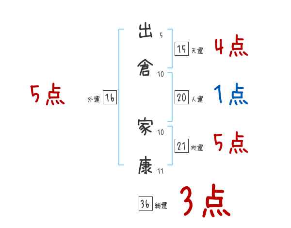 総運![]() | 出倉家康さんの総運は36画の3つ星!先見性が豊かです。多少神経質で苦労することも。 あなたの人生を表す1番重要な運勢です。生涯を通じて影響する総合運となり、主に50歳以降の晩年期に影響を及ぼします。 |