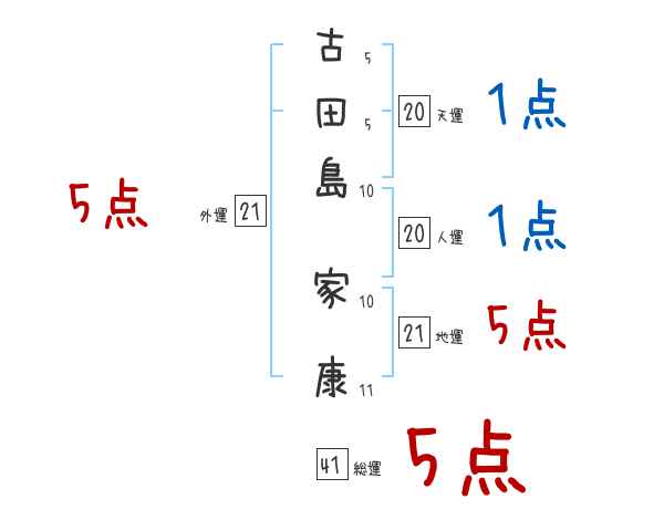 天運![]() | 古田島家康さんの天運は20画の1つ星!社交が苦手。人とは違った才能があり波乱万丈な人生かも。 家系が持つ宿命的な運勢を表します。祖先から受け継いだ苗字ですので自分の力が及びません。家柄を象徴します。 |