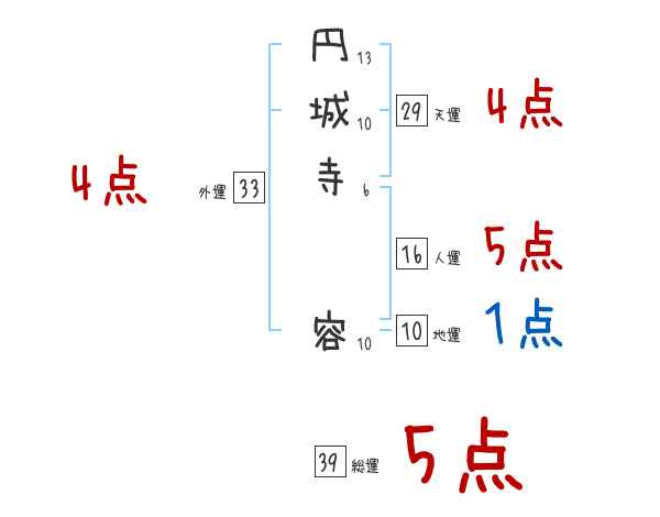 総運![]() | 円城寺容さんの総運は39画の5つ星!社交性に優れ人望が厚い。人の上に立ち成功する。 あなたの人生を表す1番重要な運勢です。生涯を通じて影響する総合運となり、主に50歳以降の晩年期に影響を及ぼします。 |
