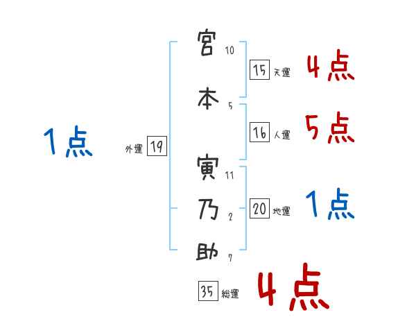 人運![]() | 宮本寅乃助さんの人運は16画の5つ星!人望が厚く大きく発展する。逆転成功が見える。 性格や才能などを表す2番目に重要な運勢です。人間関係や協調性、社会的な成功に影響します。主に20歳から50歳ぐらいまでの中年期の運勢を表します。 |