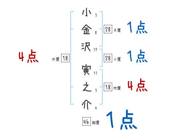 天運![]() | 小金沢寅之介さんの天運は28画の1つ星!家庭環境に注意。スポーツで活躍できる能力があるかも。 家系が持つ宿命的な運勢を表します。祖先から受け継いだ苗字ですので自分の力が及びません。家柄を象徴します。 |