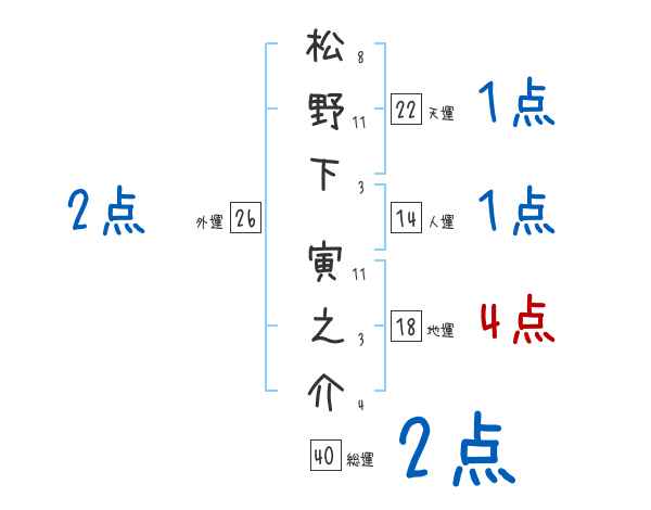 天運![]() | 松野下寅之介さんの天運は22画の1つ星!努力することが苦手ないっぽう手先が器用。芸術性にも優れる。 家系が持つ宿命的な運勢を表します。祖先から受け継いだ苗字ですので自分の力が及びません。家柄を象徴します。 |
