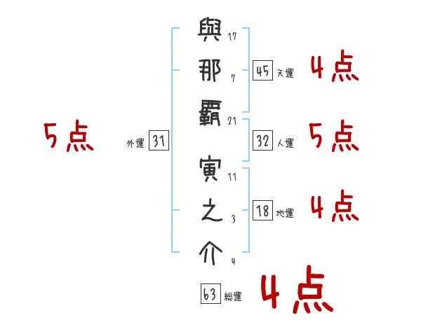 天運![]() | 與那覇寅之介さんの天運は45画の4つ星!もくもくと物事を進め達成する。地味な努力家。 家系が持つ宿命的な運勢を表します。祖先から受け継いだ苗字ですので自分の力が及びません。家柄を象徴します。 |