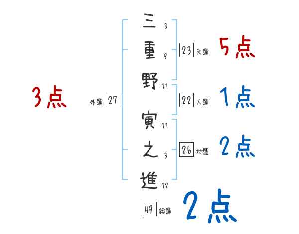 天運![]() | 三重野寅之進さんの天運は23画の5つ星!想像力に優れ活力がある。一代で成功し名誉を手に入れる。 家系が持つ宿命的な運勢を表します。祖先から受け継いだ苗字ですので自分の力が及びません。家柄を象徴します。 |