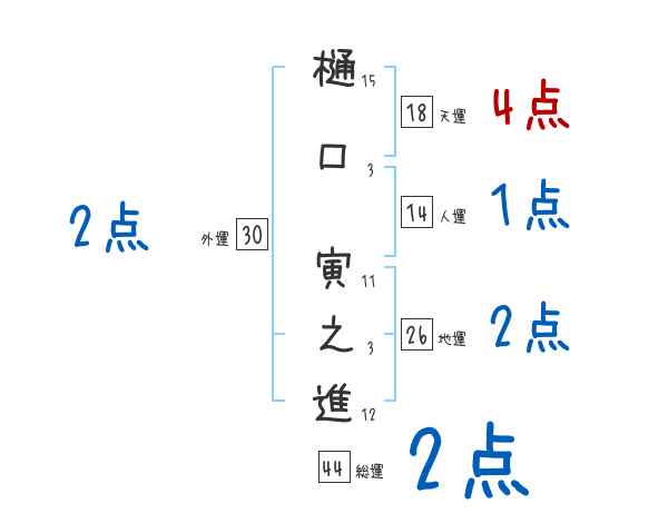 総運![]() | 樋口寅之進さんの総運は44画の2つ星!誠実で慎重な性格。物事を考えすぎないように注意しましょう。 あなたの人生を表す1番重要な運勢です。生涯を通じて影響する総合運となり、主に50歳以降の晩年期に影響を及ぼします。 |