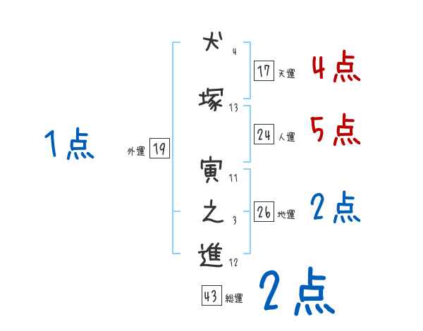| 外運  | 犬塚寅之進さんの外運は19画の1つ星!優れた才能を持ちますが、協調性が足りないことも。周りの人と協力する事を意識しましょう。生活面を象徴する運勢です。外部から受ける影響力を表し、結婚運、家庭運や職場、環境への順応性を表します。 |