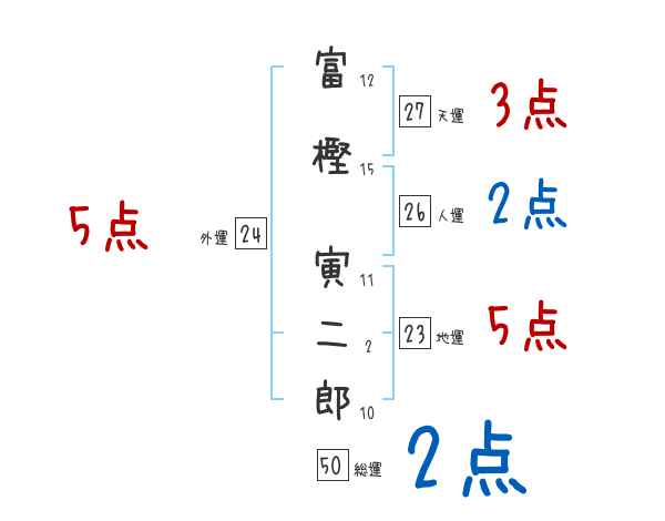 外運![]() | 富樫寅二郎さんの外運は24画の5つ星!家庭運が良く順調な人生。金運にも恵まれる。 生活面を象徴する運勢です。外部から受ける影響力を表し、結婚運、家庭運や職場、環境への順応性を表します。 |