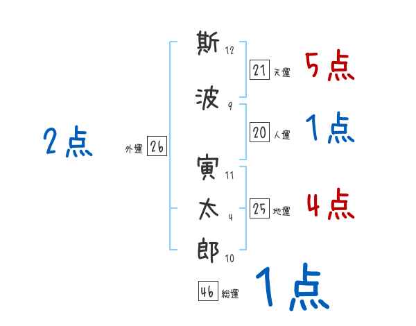 天運![]() | 斯波寅太郎さんの天運は21画の5つ星!統率力がある。独立し成功する。名誉を手に入れる。 家系が持つ宿命的な運勢を表します。祖先から受け継いだ苗字ですので自分の力が及びません。家柄を象徴します。 |