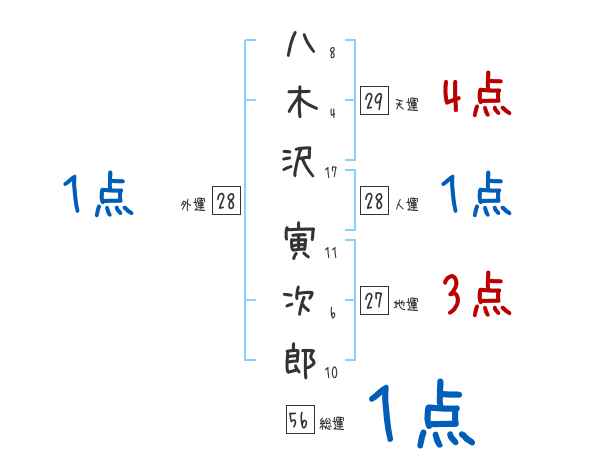 外運![]() | 八木沢寅次郎さんの外運は28画の1つ星!家庭環境に注意。スポーツで活躍できる能力があるかも。 生活面を象徴する運勢です。外部から受ける影響力を表し、結婚運、家庭運や職場、環境への順応性を表します。 |