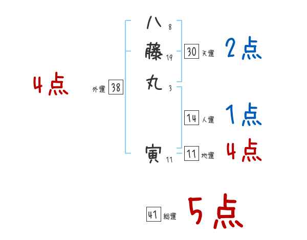 天運![]() | 八藤丸寅さんの天運は30画の2つ星!浮き沈みの激しさに注意しましょう。 家系が持つ宿命的な運勢を表します。祖先から受け継いだ苗字ですので自分の力が及びません。家柄を象徴します。 |