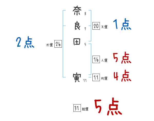 人運![]() | 奈良田寅さんの人運は16画の5つ星!人望が厚く大きく発展する。逆転成功が見える。 性格や才能などを表す2番目に重要な運勢です。人間関係や協調性、社会的な成功に影響します。主に20歳から50歳ぐらいまでの中年期の運勢を表します。 |