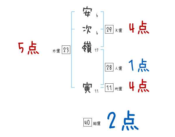 人運![]() | 安次嶺寅さんの人運は28画の1つ星!家庭環境に注意。スポーツで活躍できる能力があるかも。 性格や才能などを表す2番目に重要な運勢です。人間関係や協調性、社会的な成功に影響します。主に20歳から50歳ぐらいまでの中年期の運勢を表します。 |