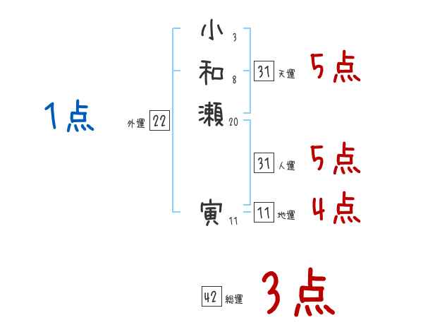総運![]() | 小和瀬寅さんの総運は42画の3つ星!病気に注意。多芸であるが消極的でおとなしい。 あなたの人生を表す1番重要な運勢です。生涯を通じて影響する総合運となり、主に50歳以降の晩年期に影響を及ぼします。 |