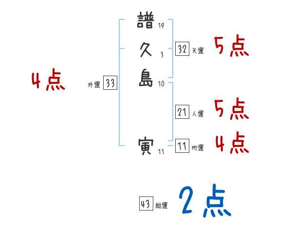 天運![]() | 譜久島寅さんの天運は32画の5つ星!柔軟性があり成功する。チャンスが多く金運が良い。 家系が持つ宿命的な運勢を表します。祖先から受け継いだ苗字ですので自分の力が及びません。家柄を象徴します。 |