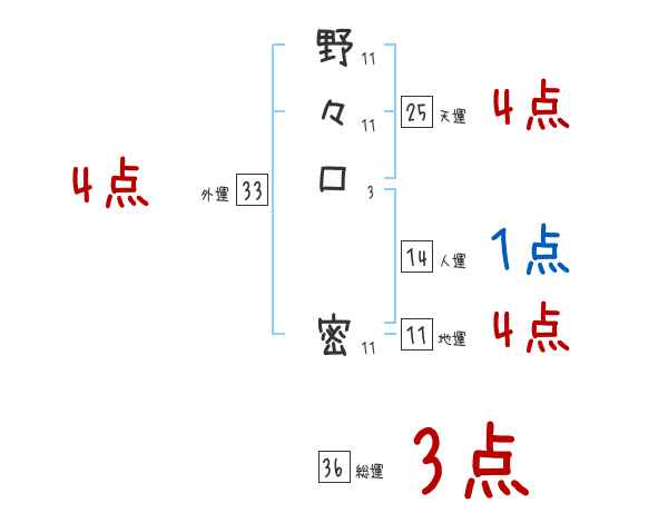 外運![]() | 野々口密さんの外運は33画の4つ星!権力志向でプライドが高い。勇気があり運を切り開き成功する。 生活面を象徴する運勢です。外部から受ける影響力を表し、結婚運、家庭運や職場、環境への順応性を表します。 |