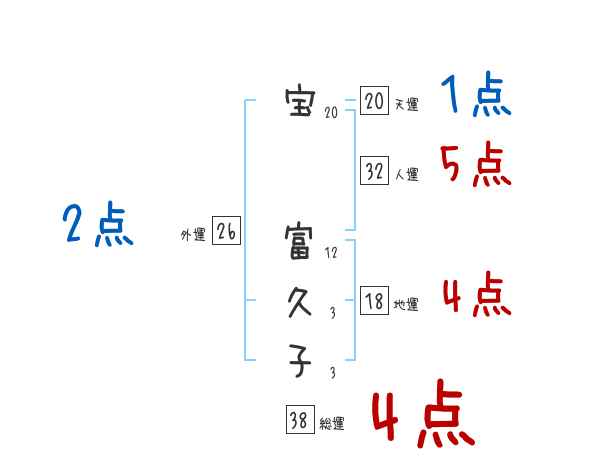 人運![]() | 宝富久子さんの人運は32画の5つ星!柔軟性があり成功する。チャンスが多く金運が良い。 性格や才能などを表す2番目に重要な運勢です。人間関係や協調性、社会的な成功に影響します。主に20歳から50歳ぐらいまでの中年期の運勢を表します。 |