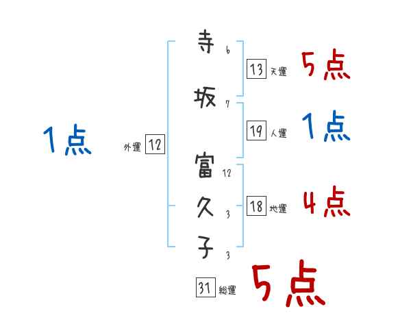 総運![]() | 寺坂富久子さんの総運は31画の5つ星!社交性があり判断力に優れる。順風満帆な人生で円満な生活。 あなたの人生を表す1番重要な運勢です。生涯を通じて影響する総合運となり、主に50歳以降の晩年期に影響を及ぼします。 |