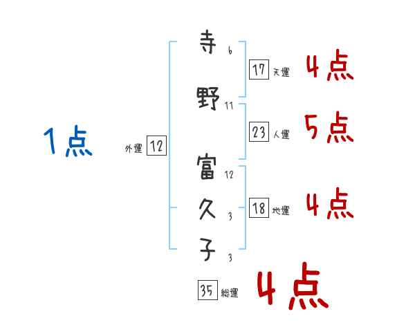 天運![]() | 寺野富久子さんの天運は17画の4つ星!積極的な行動力。地位を気づき財産を手に入れる。純粋な心と直感力。 家系が持つ宿命的な運勢を表します。祖先から受け継いだ苗字ですので自分の力が及びません。家柄を象徴します。 |